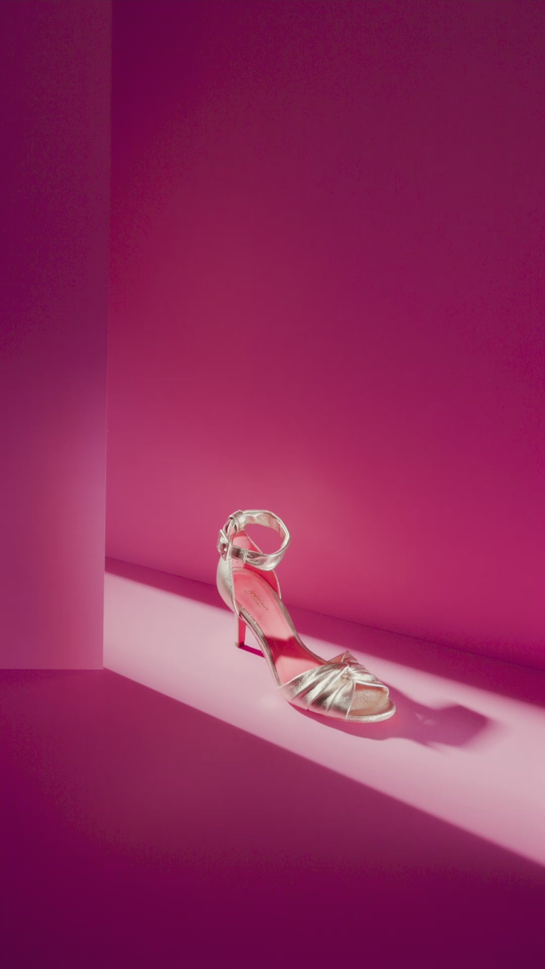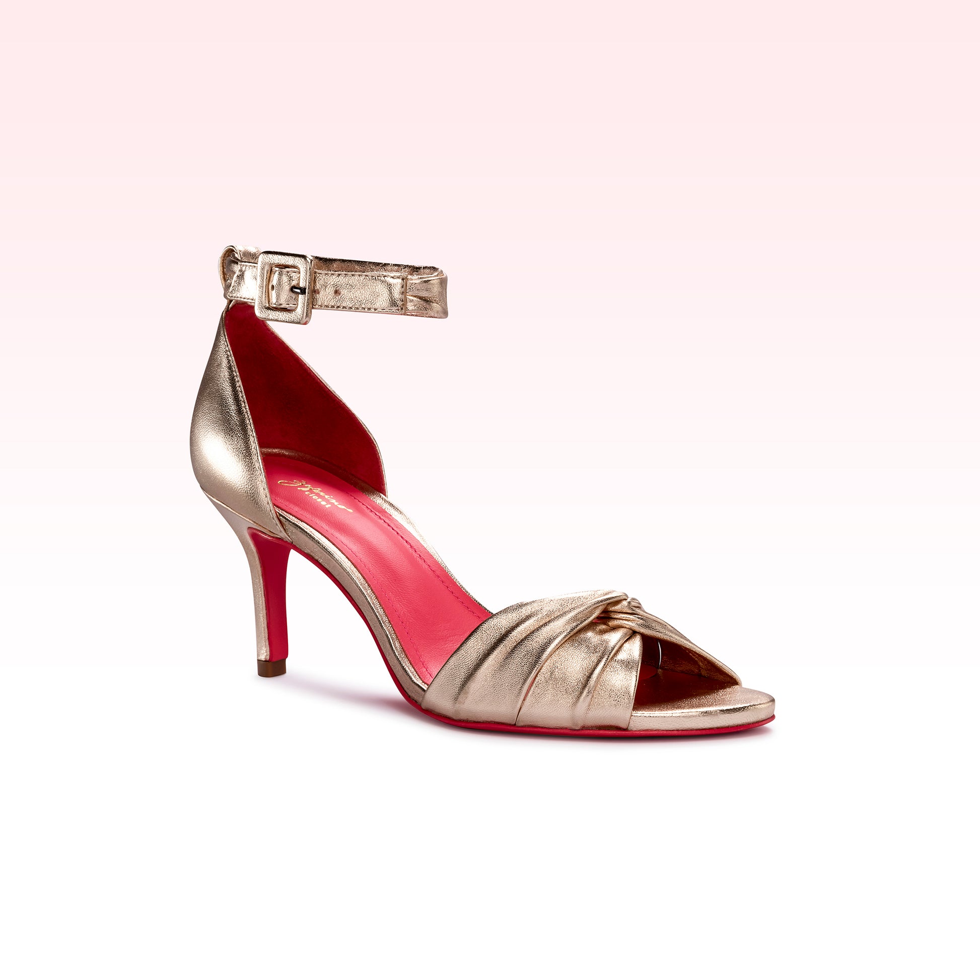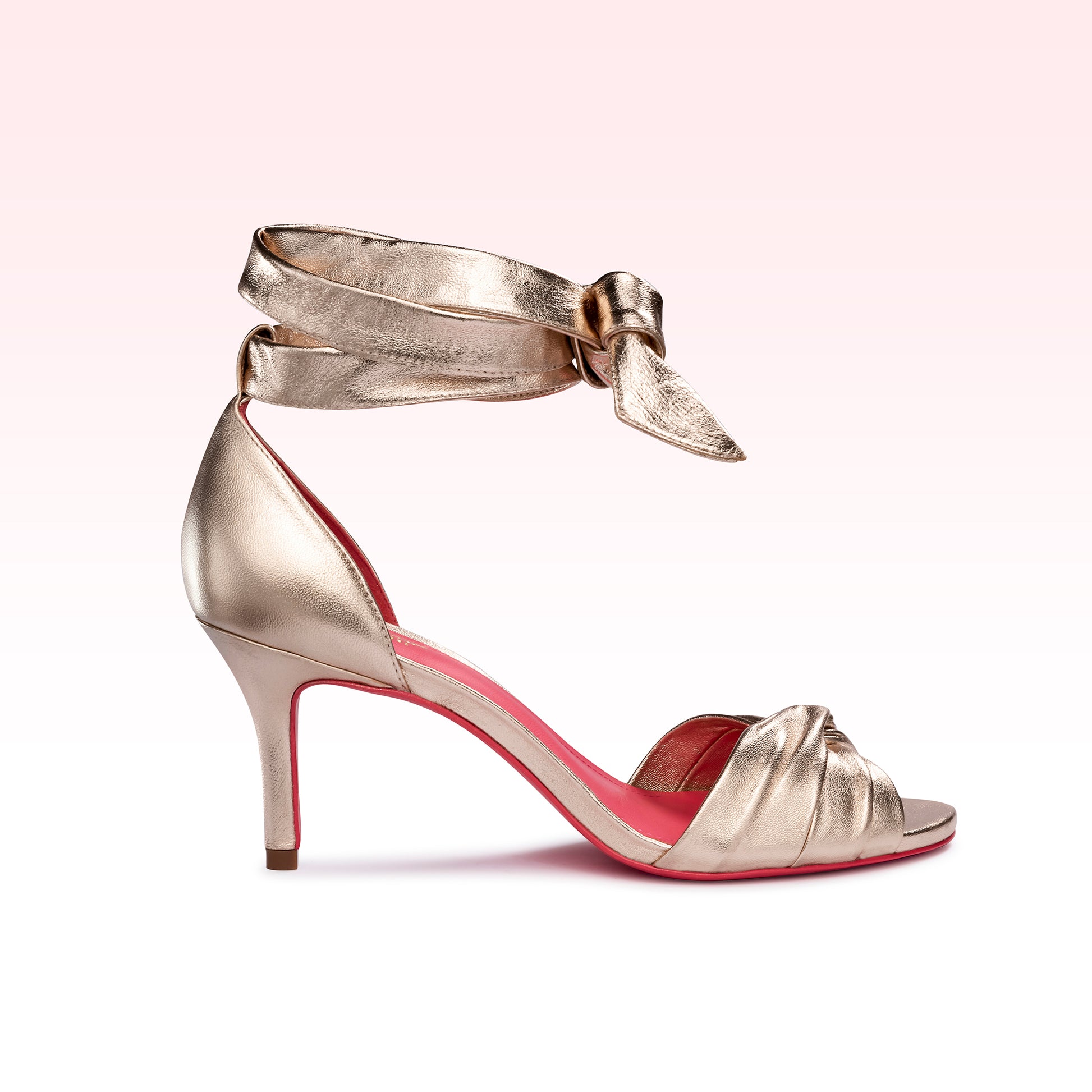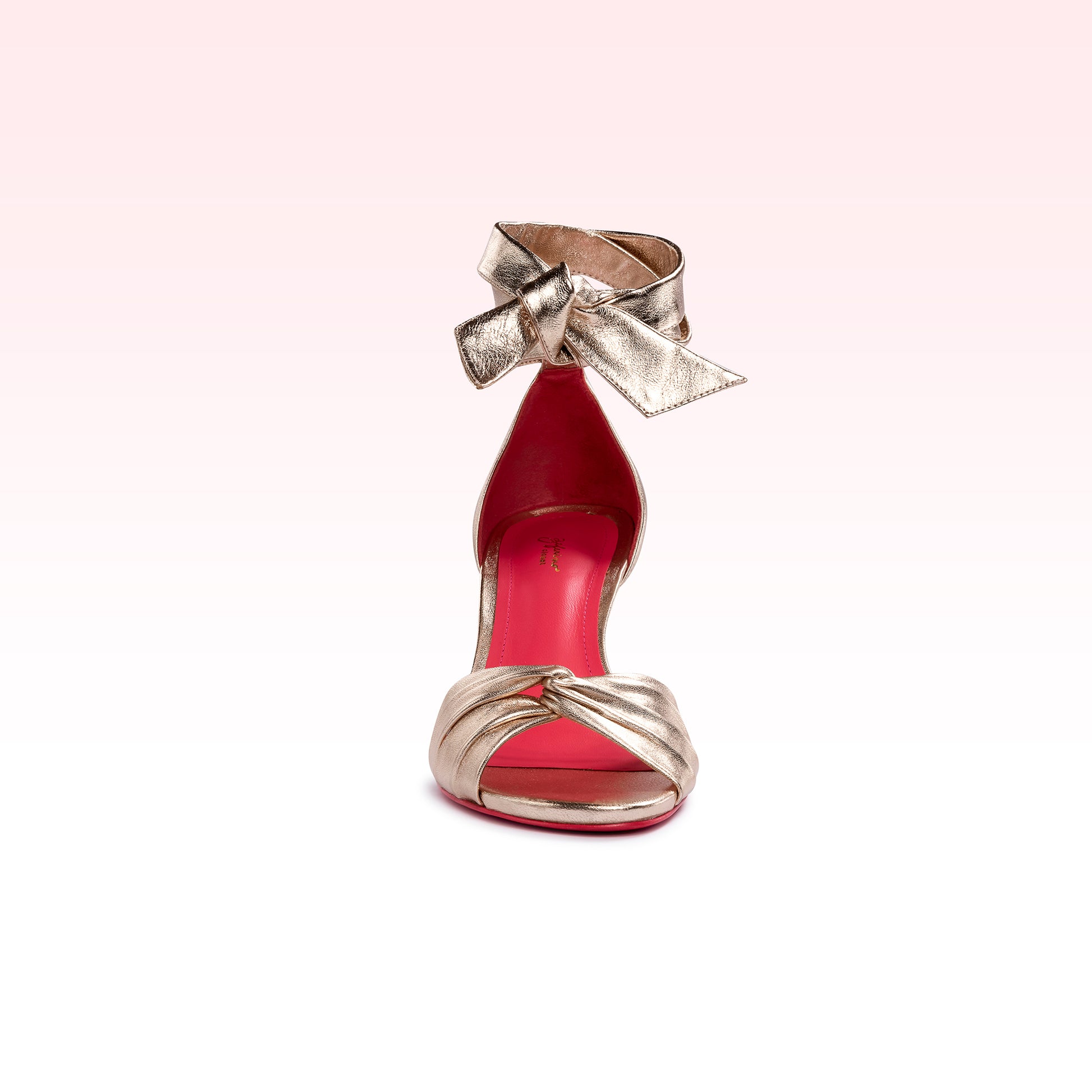 Sandália Stella em couro skin platina, com salto altura 7cm.