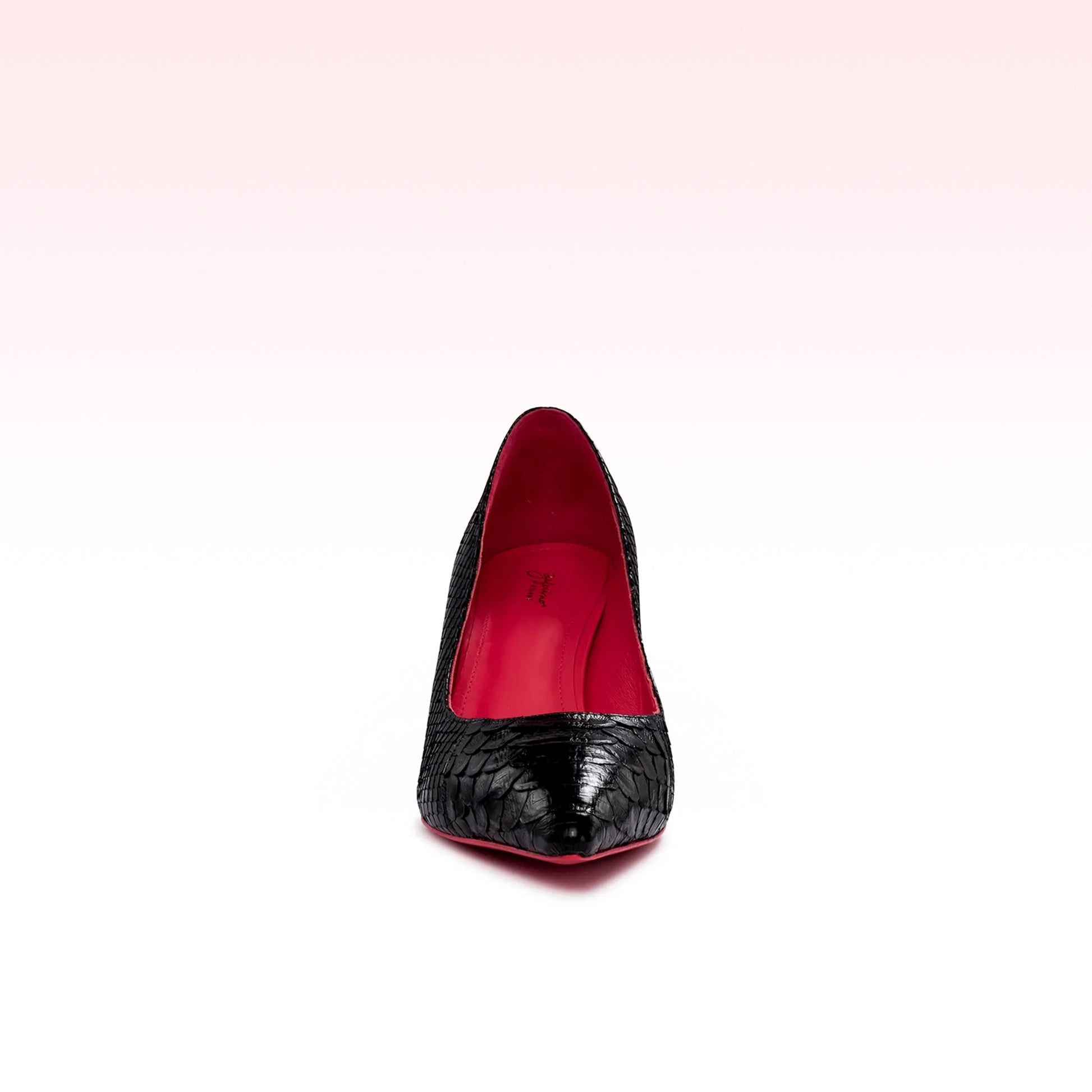 A Ninna é um ícone de feminilidade e traduz por meio do seu design todo o poder de vestir um Zeferino. Com seu elegante bico pontiagudo, o acabamento deste modelo é confeccionado em couro python sustentado por um salto de 7 cm, perfeito para um verão sofisticado e cheio de conforto.