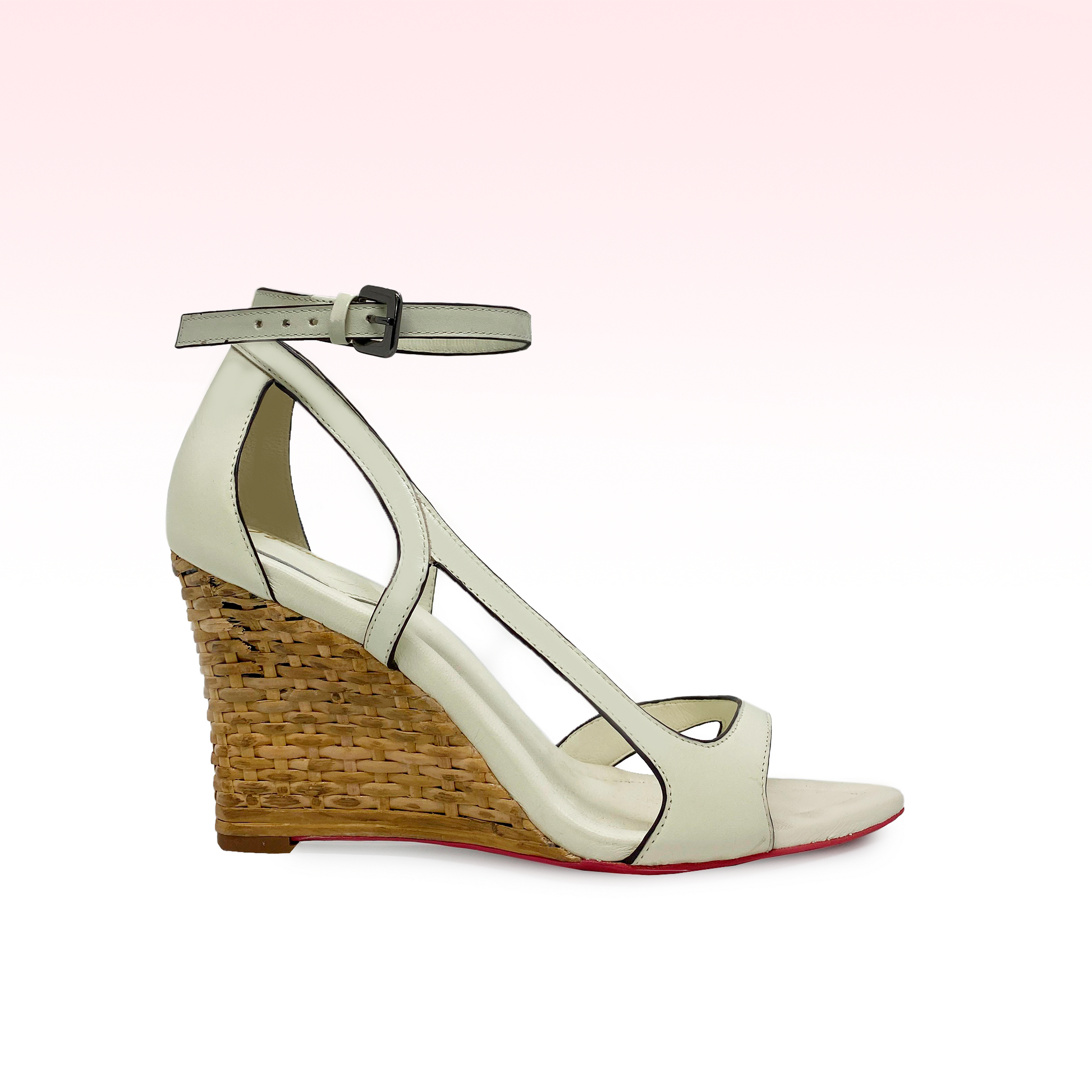 Sandália em couro vitral com salto anabela de linhas suaves, celebrando a aura noturna de deusa Selene. Sofisticado e versátil, o modelo traduz a feminilidade em sua forma mais etérea.